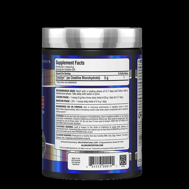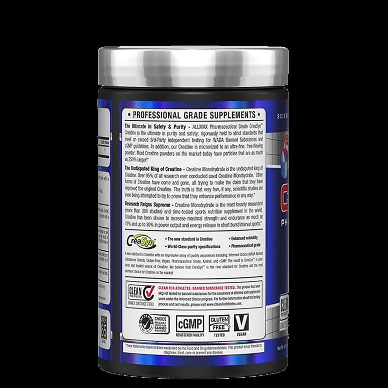 Creatina de ALLMAX es un producto hecho a base de polvo micronizado. Estudios demuestran que el aumento del nivel de creatina ayuda a retrasar la aparición de la fatiga, aumenta el metabolismo energético en las células musculares y mejora la capacidad general de entrenamiento del cuerpo.