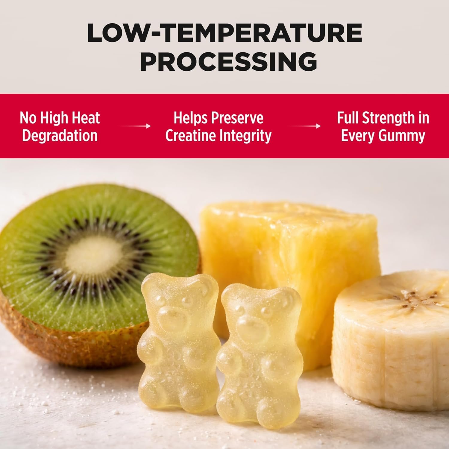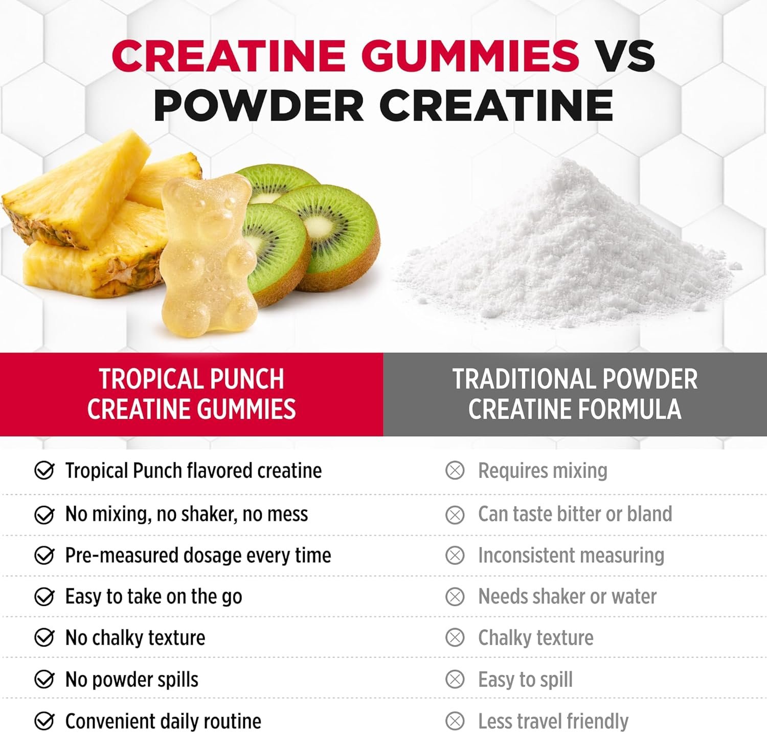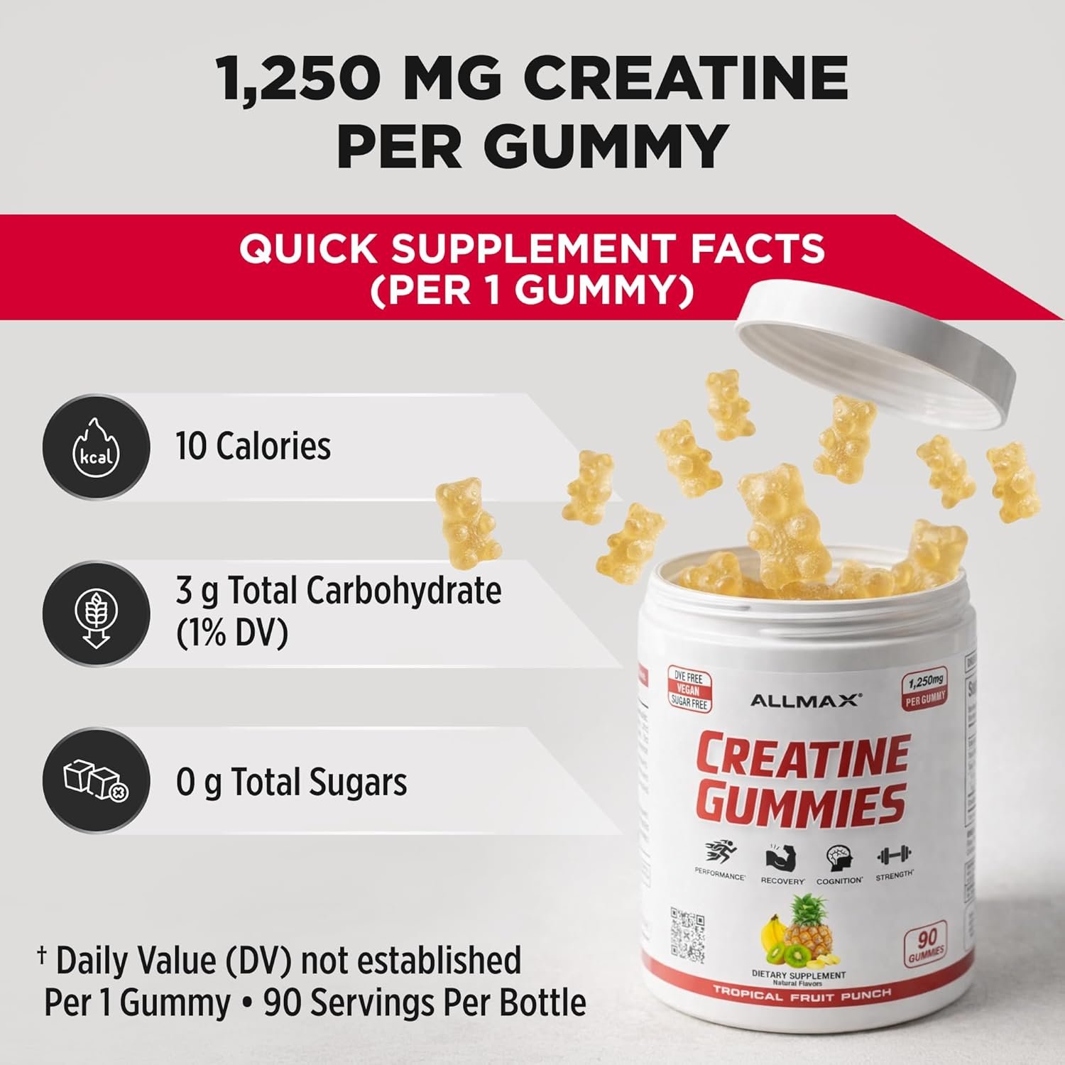 - Gomitas de monohidrato de creatina: cada gomita de creatina ofrece 1,250 mg de monohidrato de creatina en un práctico formato masticable. Suplemento diario de creatina fácil sin polvos ni mezcla.
