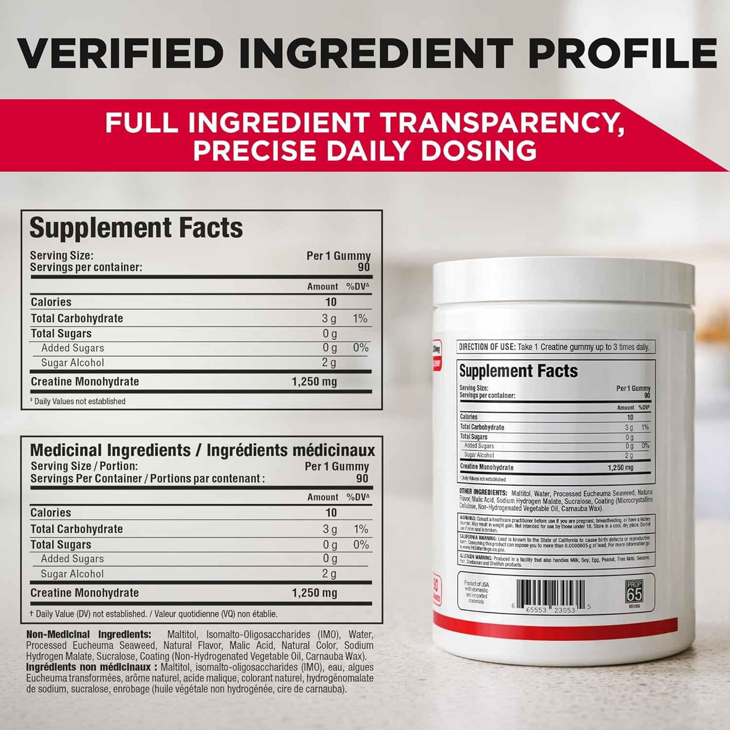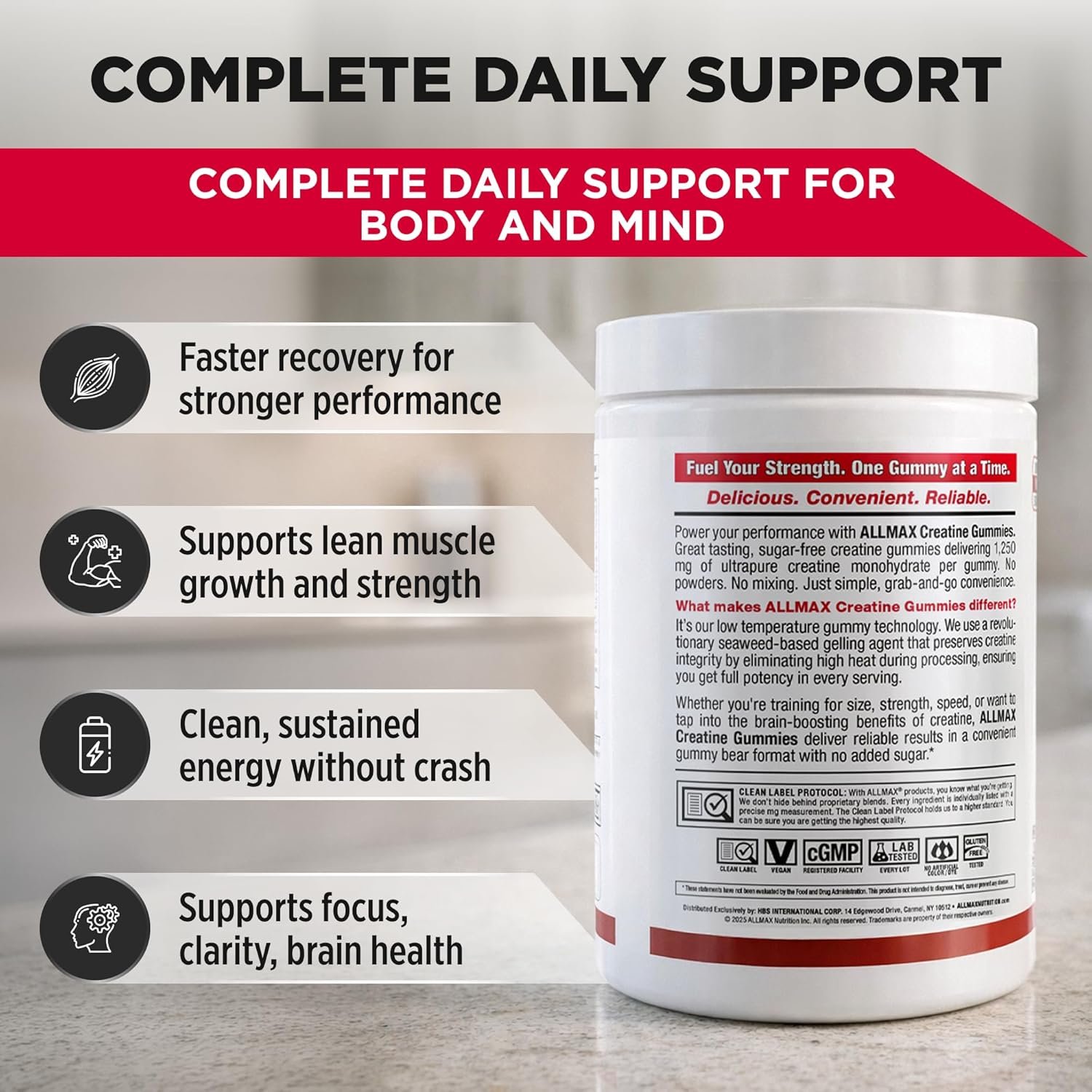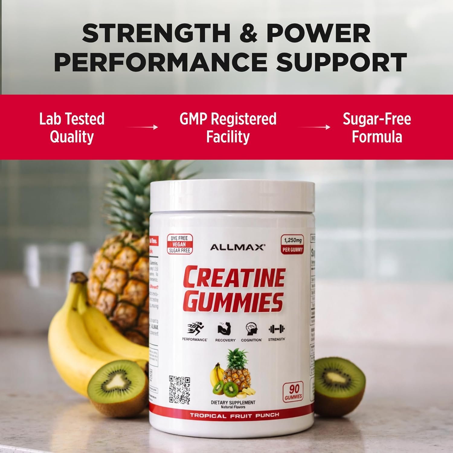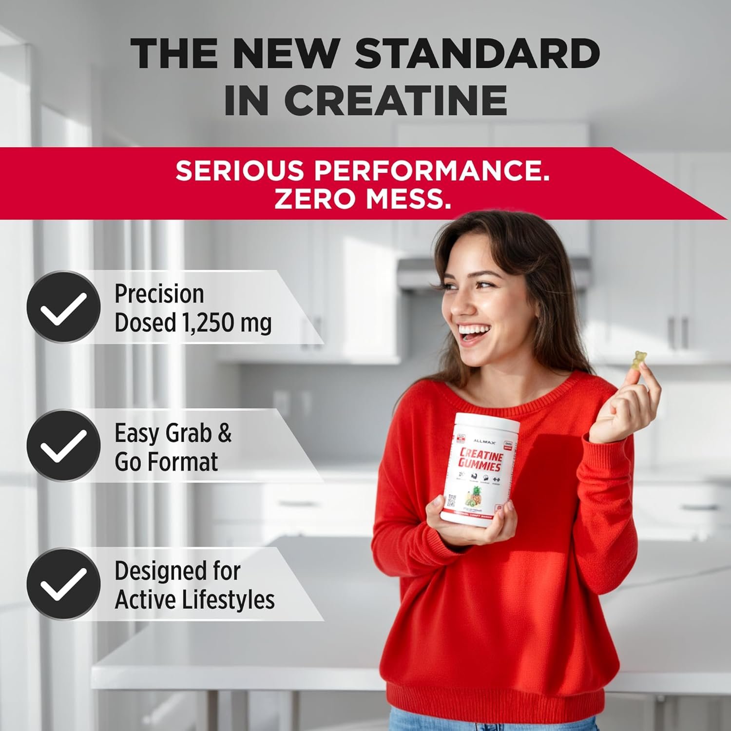 - Gomitas de monohidrato de creatina: cada gomita de creatina ofrece 1,250 mg de monohidrato de creatina en un práctico formato masticable. Suplemento diario de creatina fácil sin polvos ni mezcla.